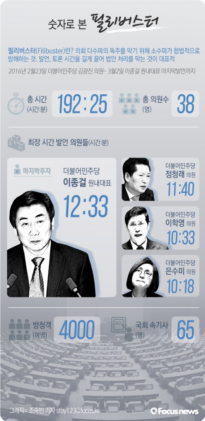 (서울=포커스뉴스) 지난달 23일 오후 7시 6분 더불어민주당 김광진 의원의 발언으로 시작된 필리버스터가 3월 2일 오후 7시 32분 이종걸 원내대표의 마지막(38번째) 발언을 끝으로 종료됐다.