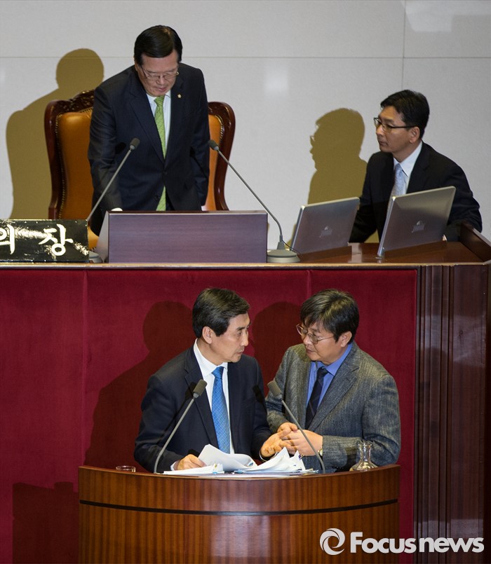(서울=포커스뉴스) 더불어민주당 이종걸 원내대표가 12시간 31분만에 필리버스터(무제한 토론)을 끝마쳤다. 39번째 필리버스터 전사로 나섰던 이 원내대표를 끝으로 지난 9일간 필리버스터는 192시간만에 종료됐다. 2일 오후 서울 여의도 국회 본회의장에서 무제한 토론 중 이종걸 원내대표와 이춘석 원내수석부대표가 대화를 나누고 있다.