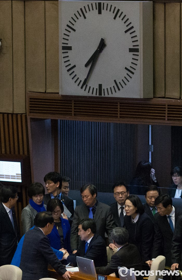 (서울=포커스뉴스) 테러방지법 직권상정에 반발해 야당이 세계 최장 기록의 필리버스터(무제한 토론)를 진행한 2일 오후 서울 여의도 국회 본회의장에서 마지막 주자인 이종걸 더불어민주당 원내대표가 토론을 마친 뒤 동료 의원들의 격려를 받으며 퇴장하고 있다. 마지막 주자로 나선 이 원내대표는 이날 정청래 의원의 기록인 11시간 40분을 경신한 12시간 31분을 기록하며 토론을 마쳤으며, 야당의 필리버스터는 약 193시간만에 종료됐다.