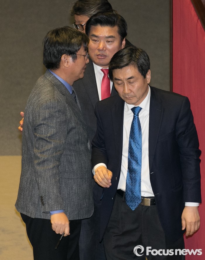 (서울=포커스뉴스) 2일 오후 서울 여의도 국회에서 열린 340회 국회(임시회) 7차 본회의에 참석한 이종걸 더불어민주당 원내대표, 이춘석 원내수석부대표가 정의화 국회의장의 모두발언에 항의하자 원유철 새누리당 원내대표, 조원진 원내수석부대표가 말리고 있다.