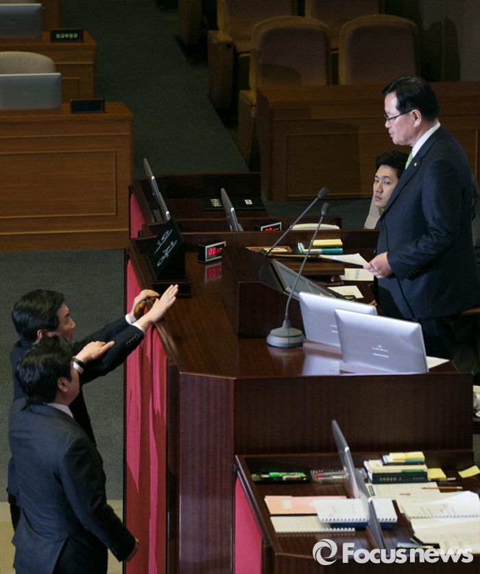 (서울=포커스뉴스) 2일 오후 서울 여의도 국회에서 열린 340회 국회(임시회) 7차 본회의에 참석한 이종걸 더불어민주당 원내대표가 정의화 국회의장의 모두발언에 항의하자 원유철 새누리당 원내대표가 말리고 있다.