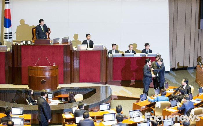 (서울=포커스뉴스) 2일 오후 서울 여의도 국회에서 열린 340회 국회(임시회) 7차 본회의에 참석한 이종걸 더불어민주당 원내대표, 이춘석 원내수석부대표가 정의화 국회의장의 모두발언에 항의하자 원유철 새누리당 원내대표, 조원진 원내수석부대표가 말리고 있다.