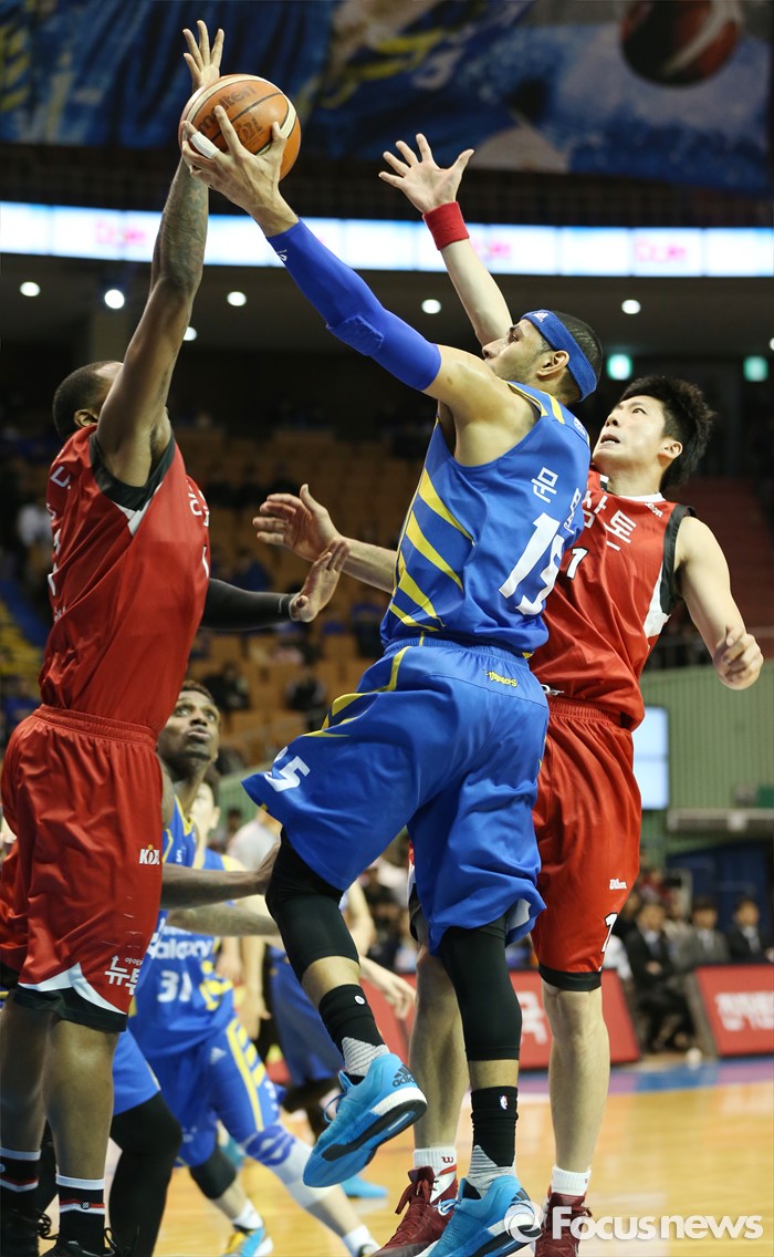 (서울=포커스뉴스) 2일 서울 잠실실내체육관에서 열린 2015-2016 프로농구 삼성-KGC 6강플레이오프 4차전에서 삼성 문태영의 레이업슛을 KGC 찰스 로드가 블록으로 저지하고 있다.