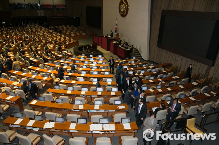 (서울=포커스뉴스) 2일 오후 서울 여의도 국회에서 열린 340회 국회(임시회) 7차 본회의에서 국민보호와 공공안전을 위한 테러방지법안에 대한 수정안(주호영 의원 외 156인 발의)의 표결이 시작되자 야당 의원들이 퇴장하고 있다. 이날 테러방지법은 야당이 표결에 참여하지 않은 재석 157인 중 찬성 156인, 반대 1인으로 통과됐다.