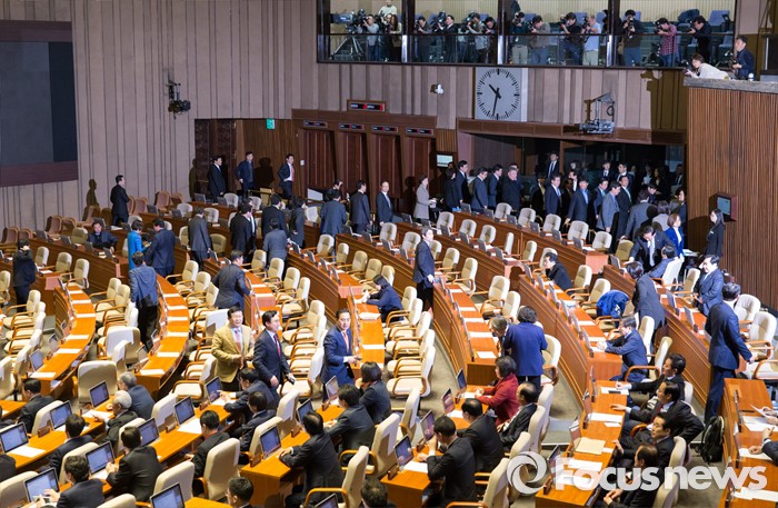 (서울=포커스뉴스) 2일 오후 서울 여의도 국회에서 열린 340회 국회(임시회) 7차 본회의에서 국민보호와 공공안전을 위한 테러방지법안에 대한 수정안(주호영 의원 외 156인 발의)이 표걸되자 야당 의원들이 퇴장하고 있다. 테러방지법안은 재석 157인 중 찬성 156인, 반대 1인으로 통과됐다.