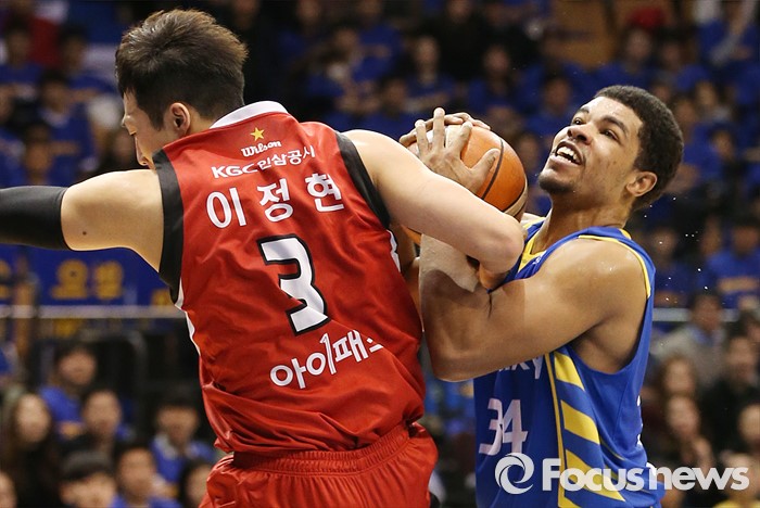 (서울=포커스뉴스) 2일 서울 잠실실내체육관에서 열린 2015-2016 프로농구 삼성-KGC 6강플레이오프 4차전에서 KGC 이정현이 삼성 와이즈의 슈팅을 저지하고 있다.