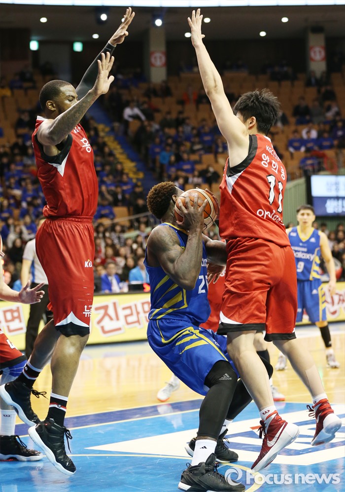 (서울=포커스뉴스) 2일 서울 잠실실내체육관에서 열린 2015-2016 프로농구 삼성-KGC 6강플레이오프 4차전에서 삼성 라틀리프의 골밑 공격에 KGC 찰스 로드와 양희종이 앞 뒤에서 마크하고 있다.