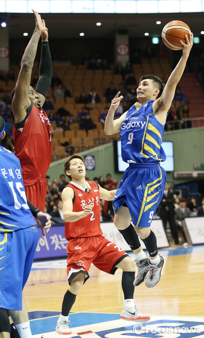 (서울=포커스뉴스) 2일 서울 잠실실내체육관에서 열린 2015-2016 프로농구 삼성-KGC 6강플레이오프 4차전에서 삼성 주희정이 KGC 찰스 로드의 마크를 피하며 레이업슛을 시도하고 있다.