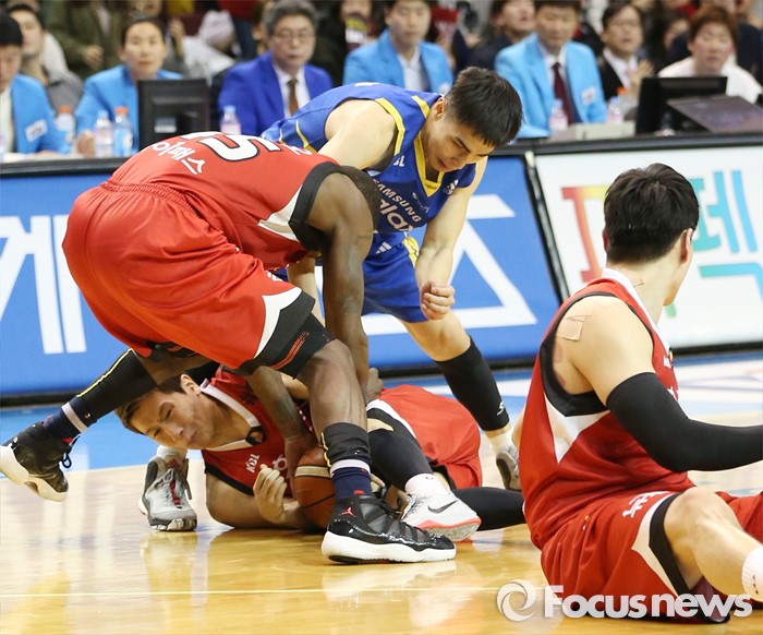 (서울=포커스뉴스) 2일 서울 잠실실내체육관에서 열린 2015-2016 프로농구 삼성-KGC 6강플레이오프 4차전에서 삼성 문태영이 놓친 볼을 KGC 김기윤이 잡은후 넘어지자 삼성 주희정이 달려들고 있다.