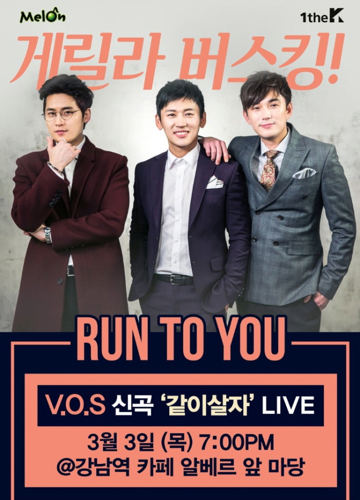 소속사 해피페이스 엔터테인먼트는 2일 공식 SNS를 통해 “3월3일 저녁 7시 강남역 알베르카페 앞 마당에서 VOS(최현준·박지헌·김경록)의 신곡 ‘같이살자’ 첫 버스킹 공연이 펼쳐집니다. 다들 놀러오세요”라는 글과 함께 버스킹을 예고하는 포스터를 공개했다.