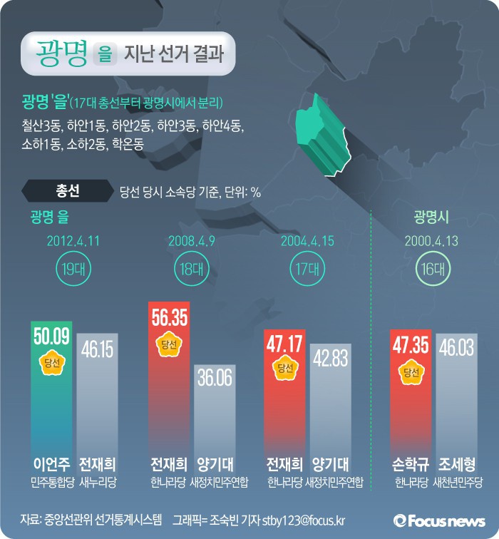 (서울=포커스뉴스) 야권 지지성향이 월등히 높은 광명시는 ‘야당의 텃밭’이라는 불리는 선거구답게 지난 18대 대선과 6회 전국동시지방선거에서 야당이 우세했다.