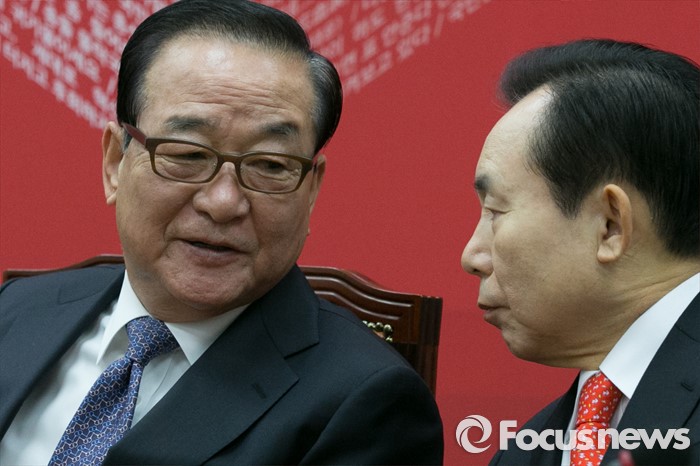 (서울=포커스뉴스) 서청원(왼쪽) 새누리당 최고위원과 이인제 최고위원이 3일 오전 서울 여의도 국회에서 열린 최고위원회의에 참석해 대화하고 있다.