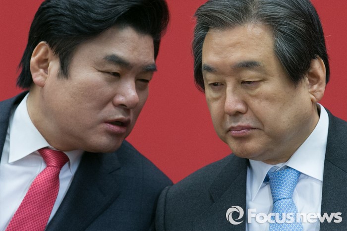 (서울=포커스뉴스) 김무성(오른쪽) 새누리당 대표와 원유철 원내대표가 3일 오전 서울 여의도 국회에서 열린 최고위원회의에 참석해 대화하고 있다.