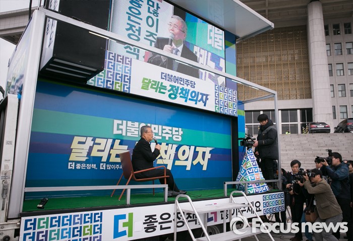 (서울=포커스뉴스) 김종인 더불어민주당 비대위 대표가 3일 오전 서울 여의도 국회 앞에서 열린 달리는 정책의자 발대식에 참석해 홍보영상을 촬영하고 있다.