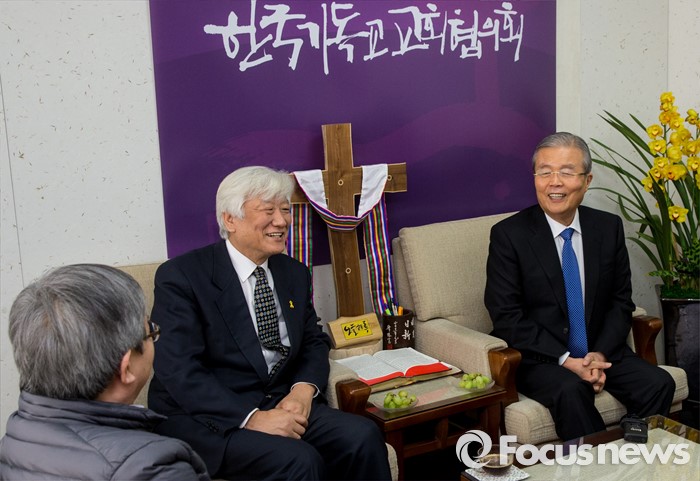 (서울=포커스뉴스) 3일 오전 서울 종로구 한국기독교회관을 방문한 김종인(맨 오른쪽) 더불어민주당 비상대책위원회 대표가 김영주(가운데) 한국기독교교회협의회 총무를 만나 대화하고 있다.