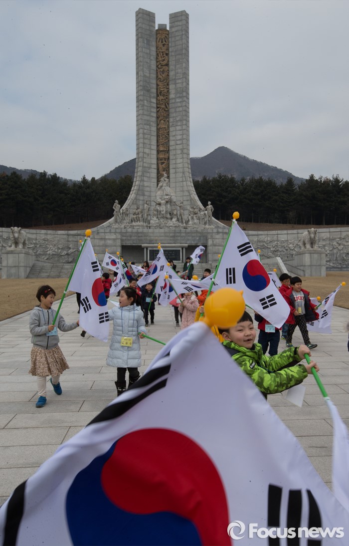 (대전=포커스뉴스) 3일 오전 입학 후 첫 수업에 들어간 대전 화정초등학교 1학년 신입생들이 대전 유성구 국립대전현충원을 찾아 참배를 마치고 태극기를 흔들며 현충원을 나서고 있다.