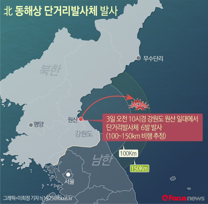 (서울=포커스뉴스) 북한이 3일 오전 10시경 강원도 원산 일대에서 단거리 발사체 수발을 동해상으로 발사해 우리 군이 발사체 종류 등에 대해 분석하고 있다. 단거리 발사체의 비행 거리는 100~150km 내외로 추정된다.