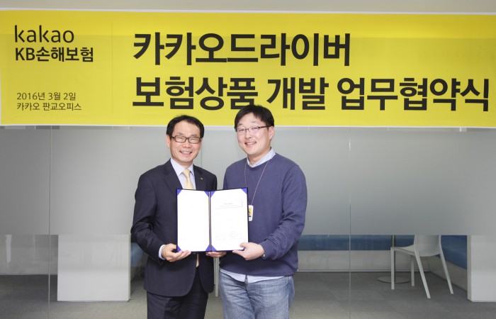 한편, 카카오드라이버와 업무협약을 맺은 동부화재는 "실시간 운행데이터를 바탕으로 보험료를 책정할 계획"이라고 밝혔다.KB손해보험은 2일 카카오가 운영하는 대리운전 서비스 '카카오 드라이버'의 보험상품 개발 업무협약을 체결했다고 밝혔다. 사진 왼쪽은 허정수 KB손해보험 부사장.<사진제공=KB손해보험>