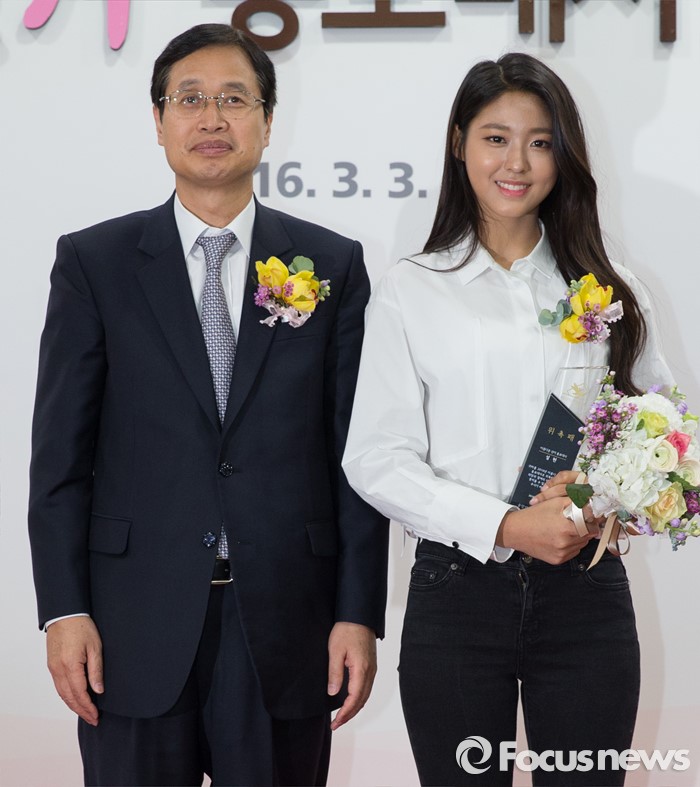 (과천=포커스뉴스) 3일 오후 경기도 과천시 중앙선거관리위원회에서 열린 '아름다운 선거 홍보대사 위촉식'에서 김용희 사무총장이 그룹 AOA의 가수 설현과 기념촬영을 하고 있다.