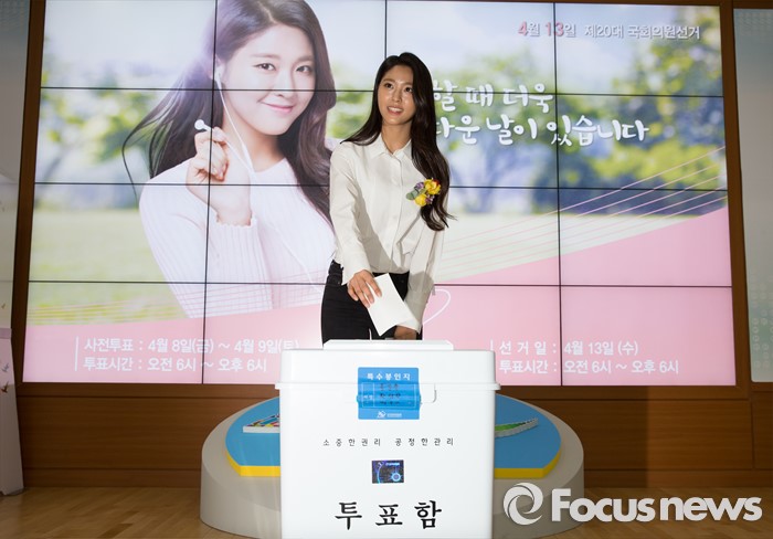 (과천=포커스뉴스) 3일 오후 경기도 과천시 중앙선거관리위원회에서 열린 '아름다운 선거 홍보대사 위촉식'에서 그룹 AOA의 가수 설현이 제20대 국회의원선거상황실에 마련된 모의 사전투표를 체험하고 있다.