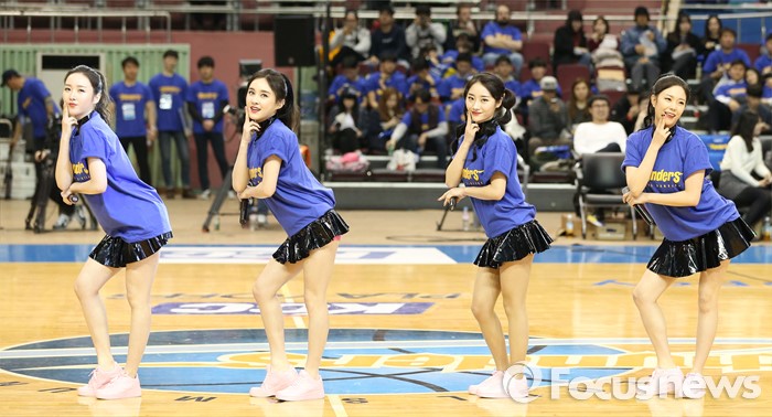 (서울=포커스뉴스) 2일 서울 잠실실내체육관에서 열린 2015-2016 프로농구 삼성-KGC 6강플레이오프 4차전 하프타임매 인기 걸그룹 식스밤이 흥겨운 춤과 노래를 관중에게 선사하고 있다.