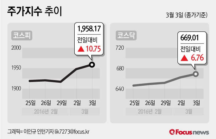 (서울=포커스뉴스) 3일 코스피지수는 전날 보다 0.55%(10.75포인트) 오른 1958.17에 장을 마쳤다. 코스닥지수는 전일 대비 1.02%(6.76포인트) 오른 669.01에 마감했다.