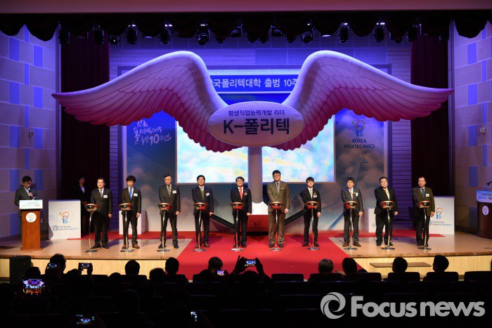 (서울=포커스뉴스) 3일 오후 한국폴리텍대학(이사장 이우영) 서울정수캠퍼스에서 열린 폴리텍대학 출범10주년 기념식에서 '평생직업능력개발 리더, K-폴리텍'이라는 뉴비전이 선포되고 있다.