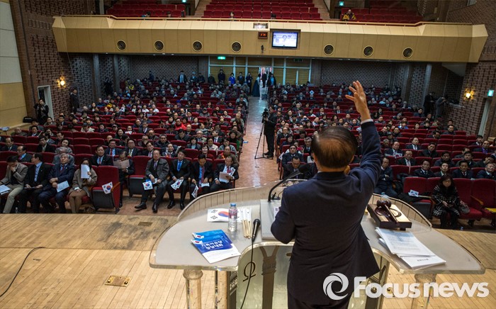 (서울=포커스뉴스) 3일 오후 서울 종로 한국기독교100주년 기념관에서 열린 기독자유당 창당대회에 참석한 한 목사가 참가자들에게 설교를 하고 있다.
