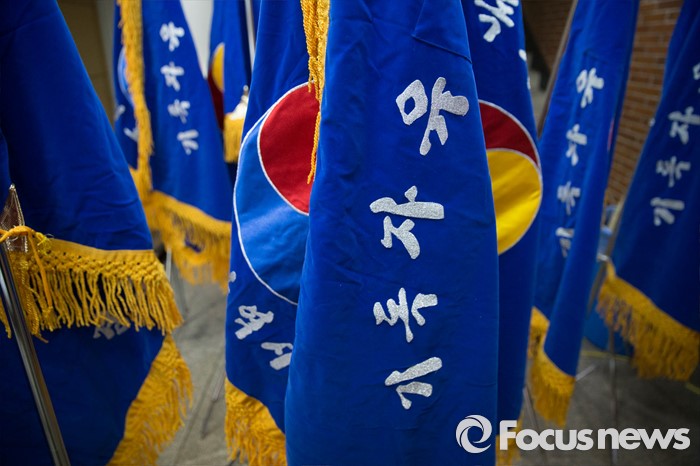 (서울=포커스뉴스) 3일 오후 서울 종로 한국기독교100주년 기념관에서 열린 기독자유당 창당대회에서 기독자유당을 상징하는 깃발이 놓여 있다.