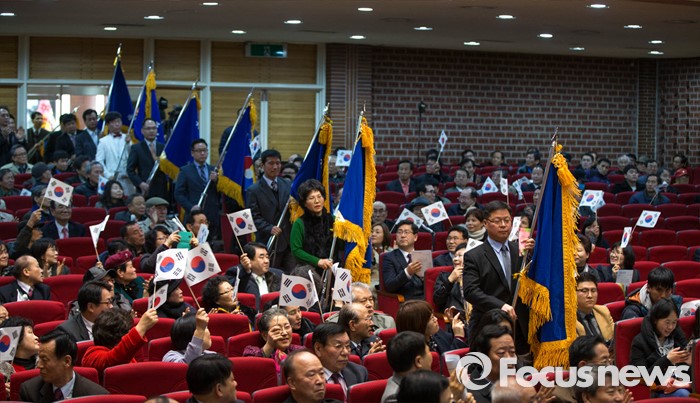 (서울=포커스뉴스) 3일 오후 서울 종로 한국기독교100주년 기념관에서 열린 기독자유당 창당대회에서 참가자들이 기독자유당을 상징하는 깃발을 들고 행사장으로 입장하고 있다.