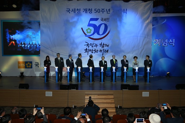 (세종=포커스뉴스) 3일 오후 세종시 정부세종 2청사 국세청에서 열린 '성실납세 감사 행사 및 개청 50주년 기념식'에서 임환수 국세청장과 내빈들이 축하 퍼포먼스를 하고 있다. <사진제공=국세청>