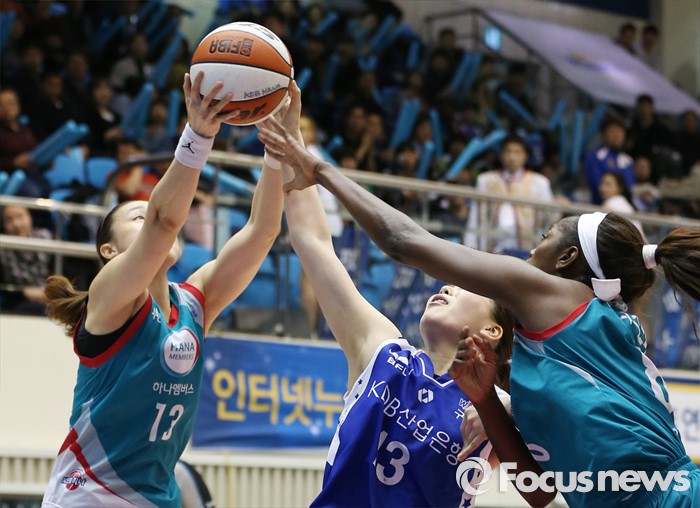 (구리=포커스뉴스) 3일 구리시체육관에서 열린 2015~2016 여자프로농구 KDB생명- KEB하나 경기에서 KEB하나 김정은이 KDB생명 김소담에 잎서 리바운드볼을 잡아내고 있다.
