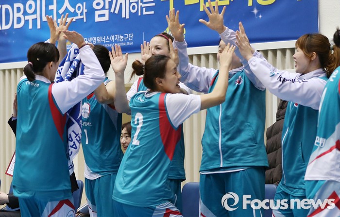 (구리=포커스뉴스) 3일 구리시체육관에서 열린 2015~2016 여자프로농구 KDB생명- KEB하나 경기에서 KEB하나 선수들이 김정은의 득점에 환호하고 있다.
