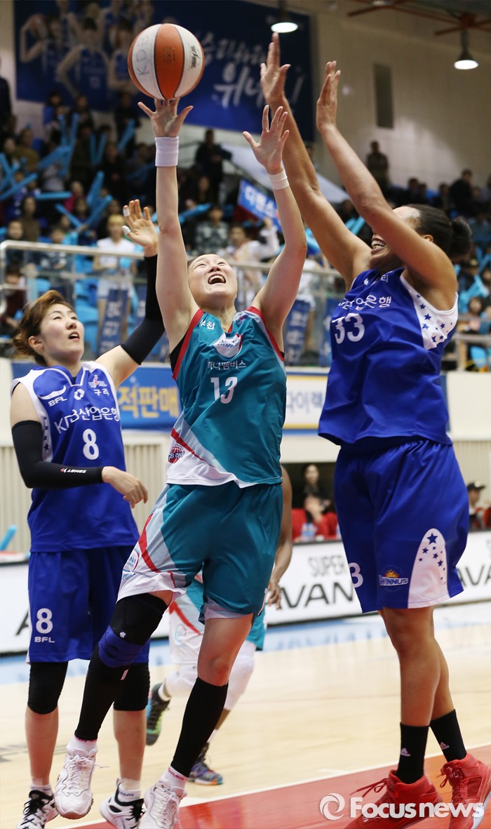 (구리=포커스뉴스) 3일 구리시체육관에서 열린 2015~2016 여자프로농구 KDB생명- KEB하나 경기에서 KEB하나 김정은이 KDB생명 플레넷을 앞에두고 골밑슛을 쏘고 있다.