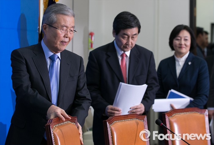 (서울=포커스뉴스) 김종인(왼쪽부터) 더불어민주당 비대위 대표, 이종걸 원내대표, 박영선 비대위원 등이 4일 오전 서울 여의도 국회에서 열린 비대위-선대위 연석회의에 참석하고 있다.