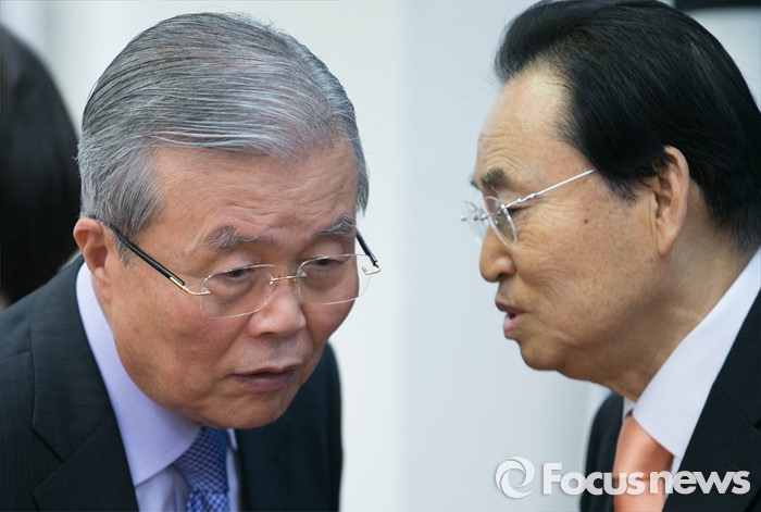 (서울=포커스뉴스) 김종인(왼쪽) 더불어민주당 비대위 대표가 4일 오전 서울 여의도 국회에서 비대위-선대위 연석회의를 마친 뒤 송현섭 전국노인위원장과 대화하고 있다.