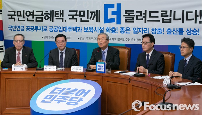 (서울=포커스뉴스) 김종인(왼쪽 세번째) 더불어민주당 비대위 대표가 4일 오전 서울 여의도 국회에서 열린 '국민연금 혜택, 국민께 더 돌려드리겠습니다 - 정책공약단 공약발표'에 참석해 인사말을 하고 있다.