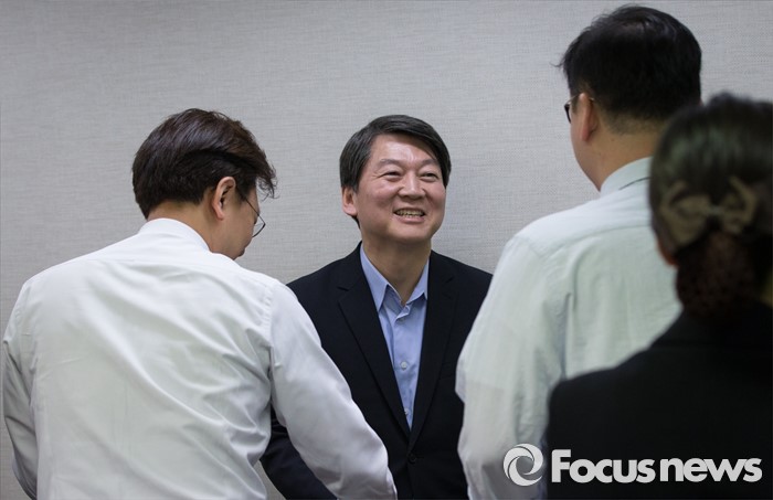 (서울=포커스뉴스) 국민의당 안철수 상임공동대표가 4일 오전 서울 마포구 국민의당 당사에서 열린 '국민의당과 함께하는 GO! 포럼'에 참석해 '젊은 행동 그룹' 멤버들과 인사를 나누고 있다.