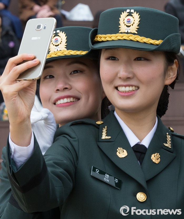 (계룡=포커스뉴스) 4일 오전 충남 계룡대 연병장에서 열린 2016년 장교 합동임관식 리허설에서 신임장교들이 셀카를 찍고 있다.