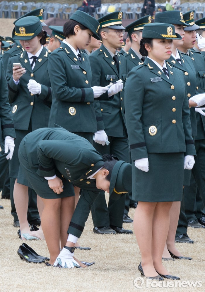 (계룡=포커스뉴스) 4일 오전 충남 계룡대 연병장에서 열린 2016년 장교 합동임관식 리허설에서 신임 여성장교가 오랜 연습으로 발에 핫팩을 대고 있다.