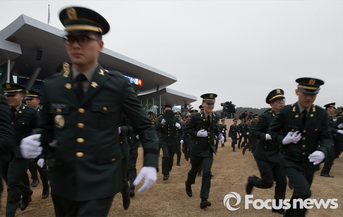 (계룡=포커스뉴스) 4일 오전 충남 계룡대 연병장에서 열린 2016년 장교 합동임관식 리허설에서 신임장교들이 기념촬영 예행연습 후 자리로 뛰어가고 있다.