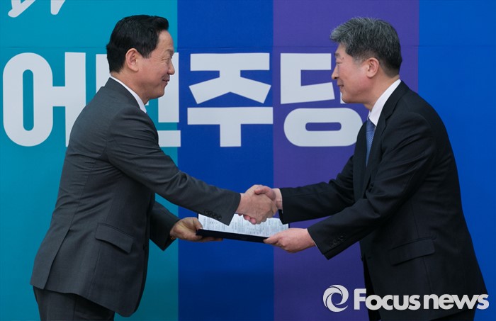 (서울=포커스뉴스) 4일 오후 서울 여의도 국회에서 열린 더불어민주당 인재영입 기자회견에 참석한 김상곤(왼쪽) 인재영입위원장이 윤종기 전 인천경찰청장으로부터 입당원서를 전달받고 있다.