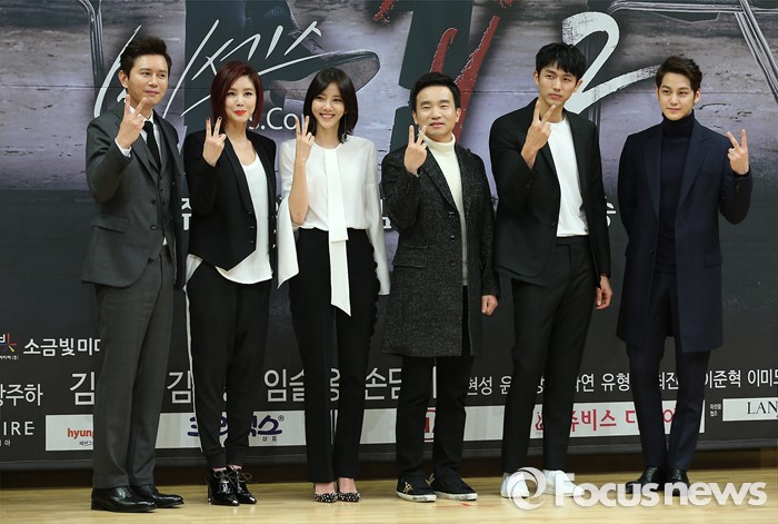 (서울=포커스뉴스) 4일 오후 서울 양천구 SBS 목동사옥에서 열린 SBS 특별기획 '미세스 캅2' 제작발표회에 참석한 출연진이 포토타임을 갖고 있다. 왼쪽부터 배우 김민종, 김성령, 손담비, 유인식(연출), 임슬옹, 김범
