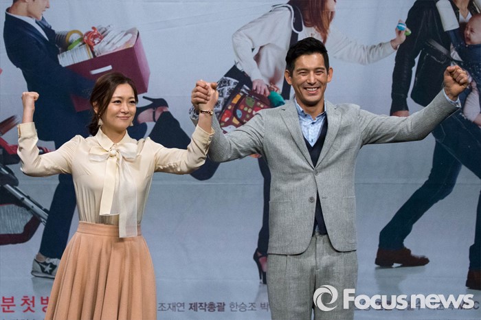 (서울=포커스뉴스) 배우 오지호와 정수영이4일 오후 서울 마포구 상암동 MBC 신사옥에서 열린 MBC 드라마 '마이 리틀 베이비' 제작발표회에 참석, 취재진을 향해 포즈를 취하고 있다.