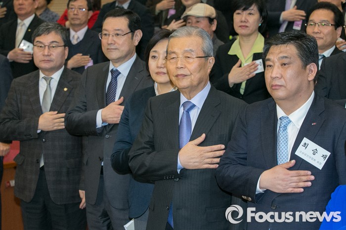 (서울=포커스뉴스) 김종인(앞줄 오른쪽 두번째) 더불어민주당 비대위 대표를 비롯한 참석자들이 4일 오후 서울 여의도 국회 의원회관에서 열린 소상공인 20대 총선 정책공약 전달식에 참석해, 국민의례를 하고 있다. 앞줄 오른쪽부터 최승재 소상공인연합회 회장, 김 대표, 박영선 비대위원, 이용섭 비대위원.