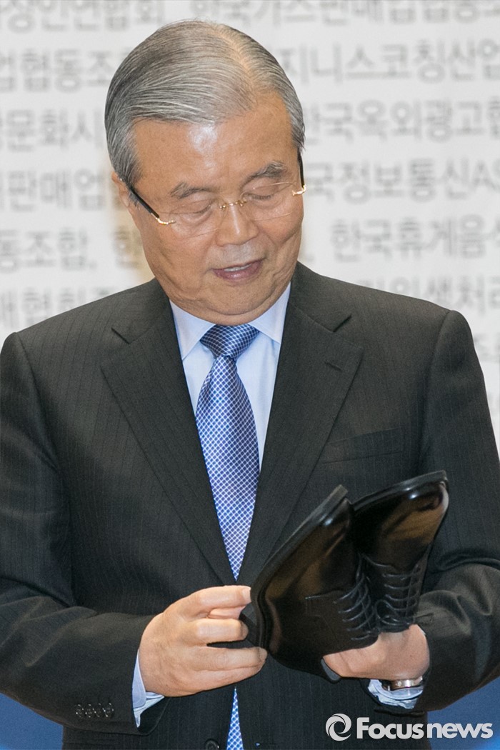 (서울=포커스뉴스) 김종인 더불어민주당 비대위 대표가 4일 오후 서울 여의도 국회 의원회관에서 열린 소상공인 20대 총선 정책공약 전달식에 참석해, 구두장인으로부터 받은 구두를 보고 있다.