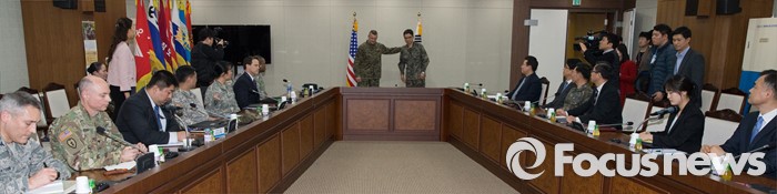(서울=포커스뉴스) 4일 오후 서울 용산구 국방부에서 열린 주한미군의 사드 배치문제를 협의하기 위한 한·미 공동실무단 첫 회의에서 한국측 대표인 장경수 국방부 정책기획관과 미국측 대표인 헤드룬드 주한미군사령부 기획참모부장이 악수를 마친 뒤 각자 자리로 향하고 있다.