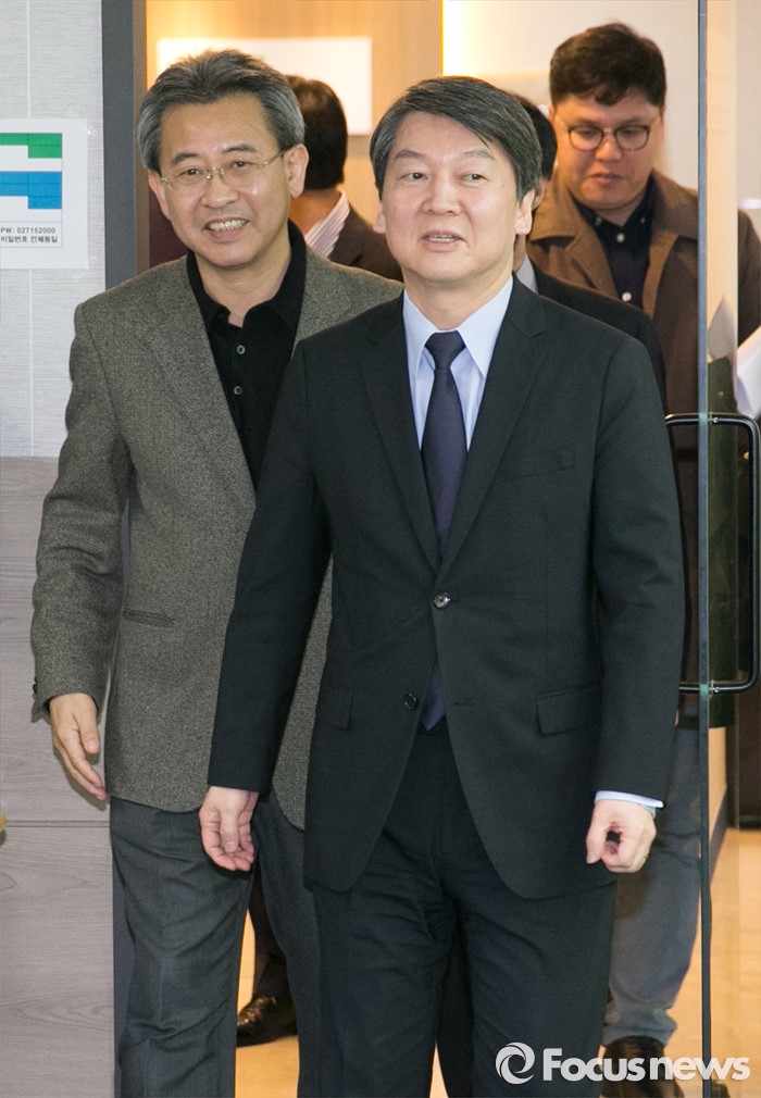 (서울=포커스뉴스) 안철수(오른쪽) 국민의당 상임공동대표가 4일 오후 서울 마포구 당사에서 열린 선거관리위원장 및 위원 위촉장 수여식에 참석해 위원장으로 위촉된 김종현 동아대학교 전임교수와 함께 입장하고 있다.