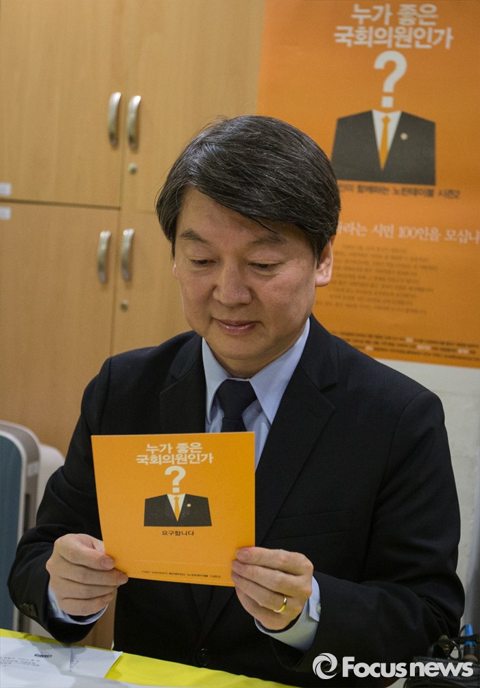 (서울=포커스뉴스) 안철수 국민의당 상임공동대표가 4일 오후 서울 종로구 희망제작소에서 열린 '노란 테이블 시민 토론회' 브리핑에 참석해 이원재 희망제작소 소장의 설명을 들으며 '누가 좋은 국회의원인가?' 엽서를 살펴보고 있다.