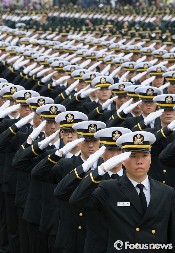 (계룡=포커스뉴스) 4일 오후 충남 계룡대 연병장에서 열린 2016년 장교 합동임관식에서 신임장교들이 거수경례를 하고 있다.